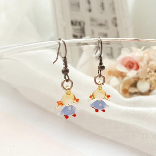 新上市★手工燒製 玻璃製 琉璃 可愛雙馬尾小女孩 耳環 耳飾