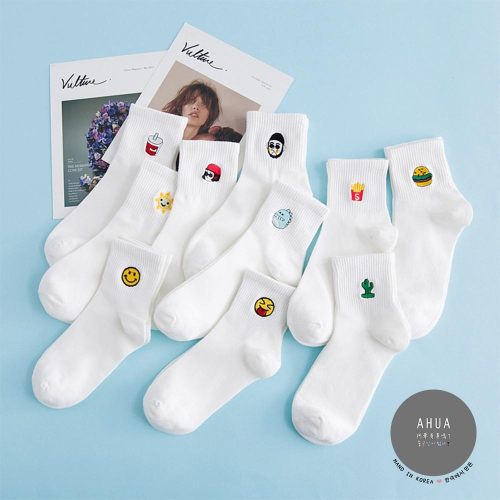 AHUA 日系襪子 刺繡小圖純色中筒襪 S0274 白襪 學生襪 純色襪子 襪子推薦 百搭女襪 女生襪子 阿華有事嗎