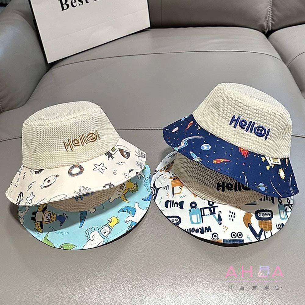 AHUA阿華有事嗎 兒童網眼刺繡hello拼接卡通感漁夫帽 H0066 簡約 百搭基本款帽子 漁夫帽 遮陽帽 童帽