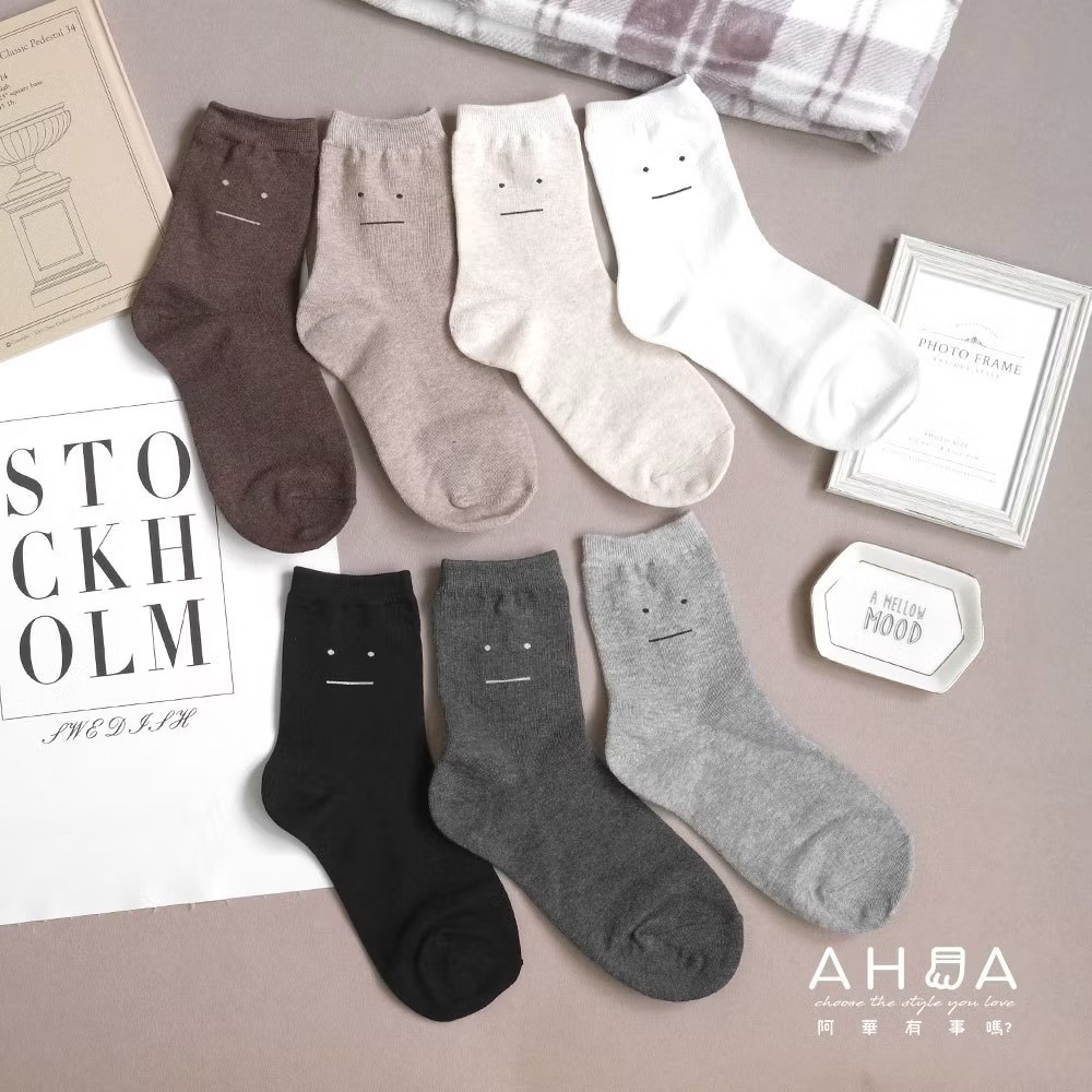 AHUA 純色一字表情中筒襪 韓國襪子 女生襪子 白襪 正韓襪子 百搭純棉襪 韓妞必備 少女襪 K2116 阿華有事嗎