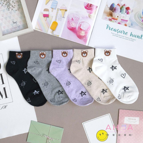 AHUA阿華有事嗎 滿版塗鴉襪口棕熊小頭短襪 K2122 正韓襪子 百搭純棉襪 韓妞必備 少女襪