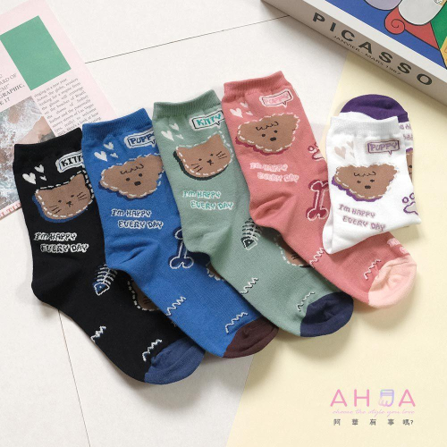 AHUA阿華有事嗎 滿版貓狗虛線疊影小圖拼色中筒襪 K2229 正韓襪子 百搭純棉襪 韓妞必備 少女襪