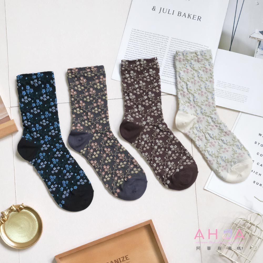 AHUA阿華有事嗎 滿版立體花朵藤蔓腳跟拼色中筒襪 K2158 正韓襪子 百搭純棉襪 韓妞必備 少女襪