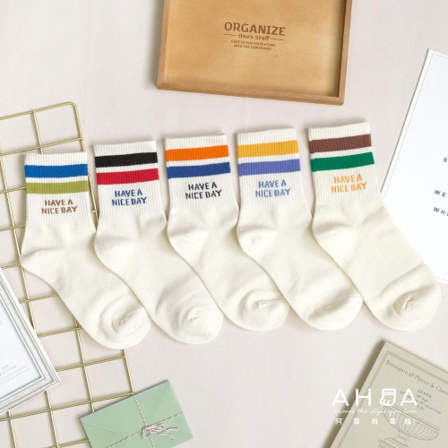 AHUA阿華有事嗎 HAVE A NICE DAY雙色條紋中筒襪 K2137 正韓襪子 百搭純棉襪 韓妞必備 少女襪