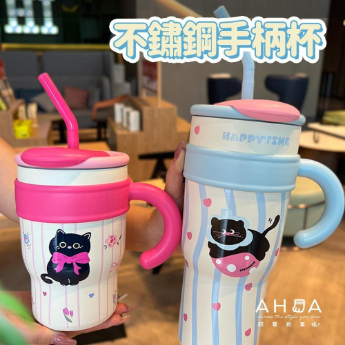 AHUA阿華有事嗎 可愛黑貓吸管保溫不鏽鋼手柄杯 F0056 生活百貨 吸管水杯 保溫杯