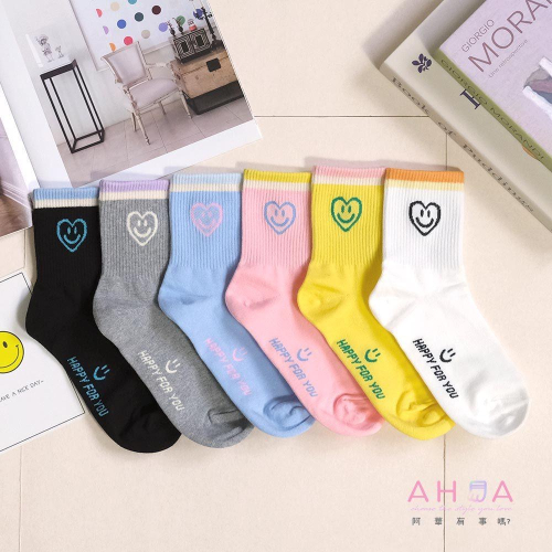 AHUA阿華有事嗎 襪口雙拼色縷空愛心笑臉中筒襪 K2300 正韓襪子 百搭純棉襪 韓妞必備 少女襪