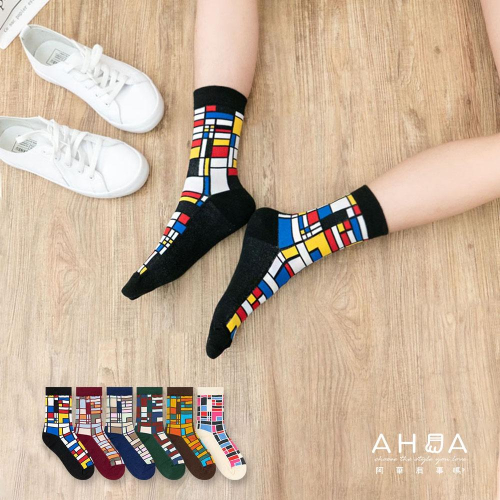 AHUA阿華有事嗎 韓國襪子 蒙德里安彩色幾何中筒襪 【K1481】少女襪 韓妞必備中筒襪 百搭純棉襪