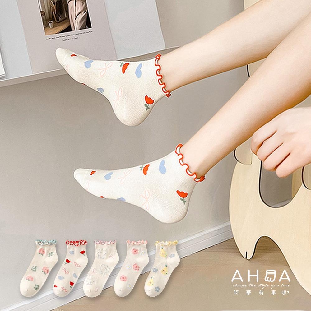 AHUA阿華有事嗎 日系襪子 QQ捲邊滿版插圖短襪【S0450】可愛 休閒 少女襪 韓妞必備短襪 百搭純棉襪