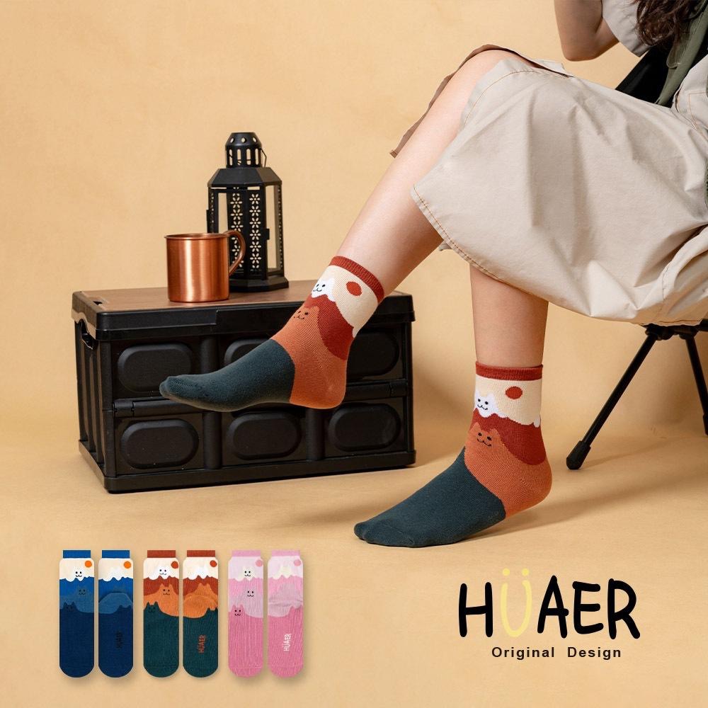 AHUA原創設計襪子 HUAER漸層富士山貓咪中筒襪 女襪 女生襪子 台灣製造 純棉親子襪 Z0010 阿華有事嗎