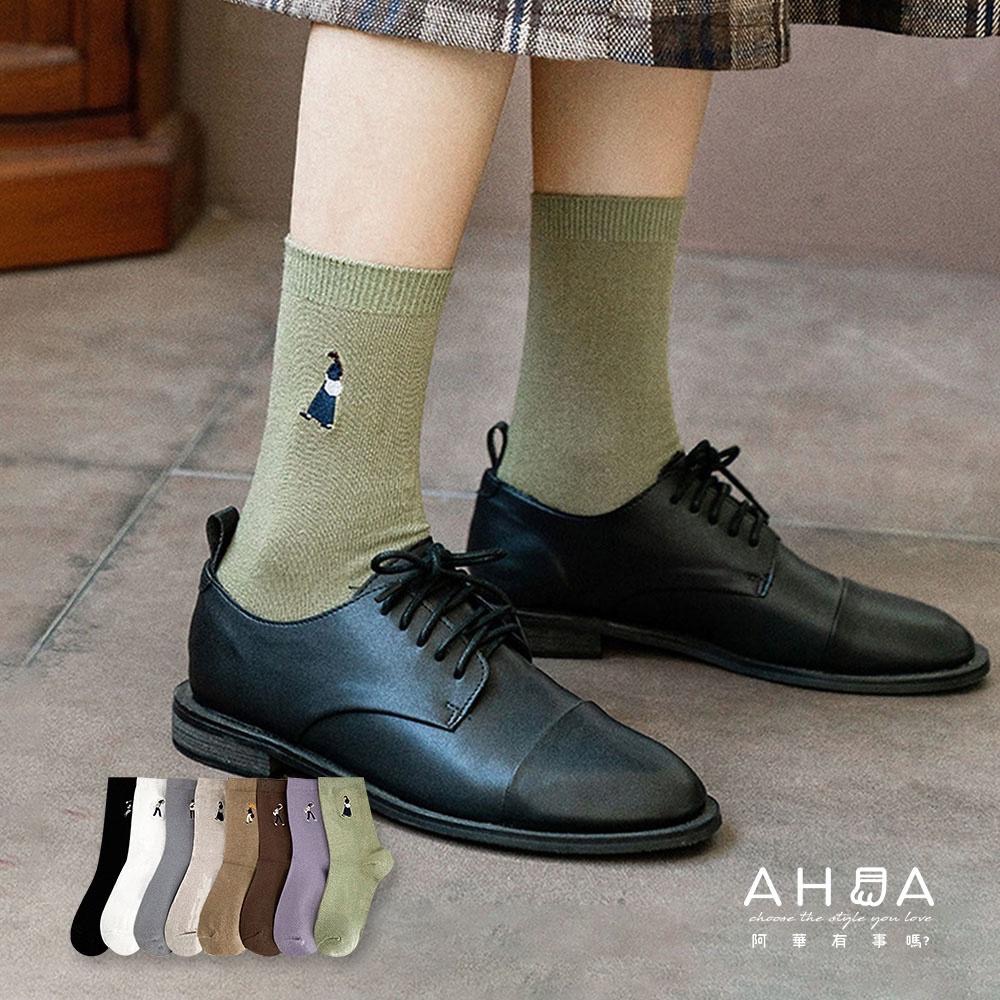 AUHA 日系襪子 文青風刺繡人物中筒襪 S0418 女襪 學生襪 白襪 黑襪 純色襪子 百搭長襪 襪子推薦 阿華有事