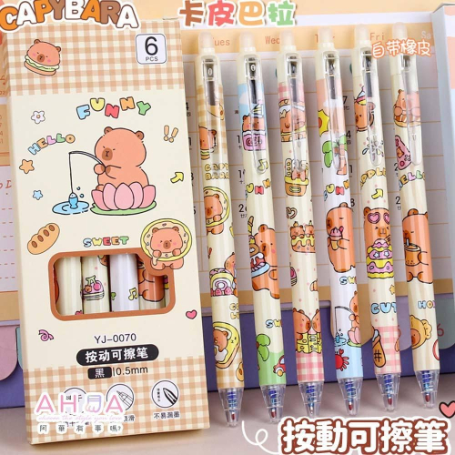 AHUA 阿華有事嗎 滿版卡通水豚按動可擦中性筆(一盒6支) O0055可愛 文具 開學用品 辦公用品