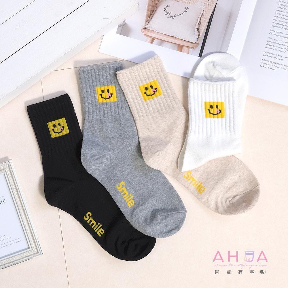 AHUA 阿華有事嗎 黃色吐舌微笑方塊中筒襪 K2306 正韓襪子 百搭純棉襪 韓妞必備 少女襪