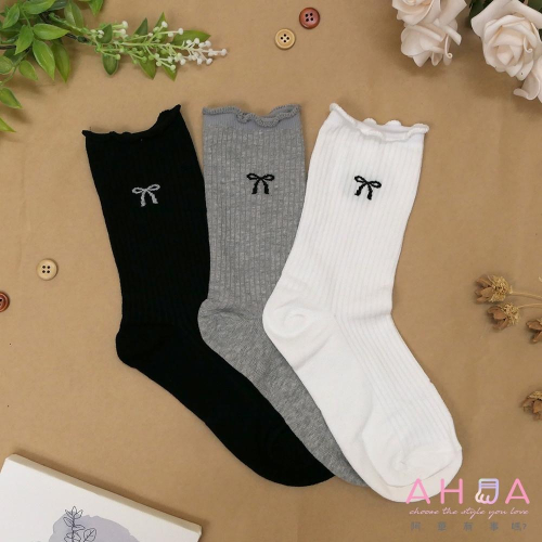 AHUA 阿華有事嗎 直坑條純色蝴蝶結木耳捲邊中筒襪 K2327 正韓襪子 百搭純棉襪 韓妞必備 少女襪