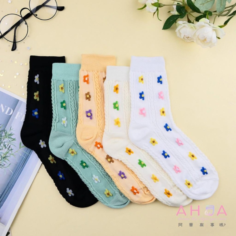AHUA 阿華有事嗎 立體針織直條三色小花中筒襪 K2334 正韓襪子 百搭純棉襪 韓系必備 少女襪