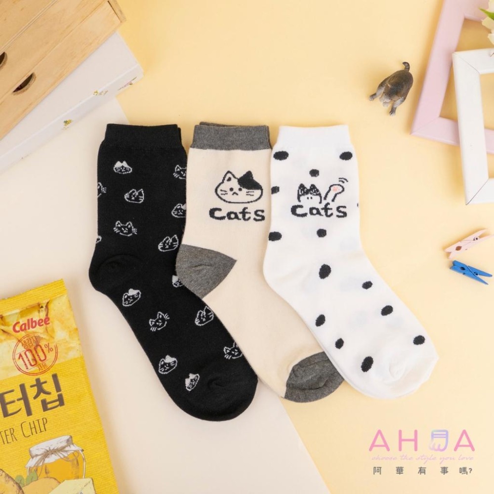AHUA 阿華有事嗎 手繪貓咪中筒襪 K2420 正韓襪子 百搭純棉襪 韓系必備 少女襪