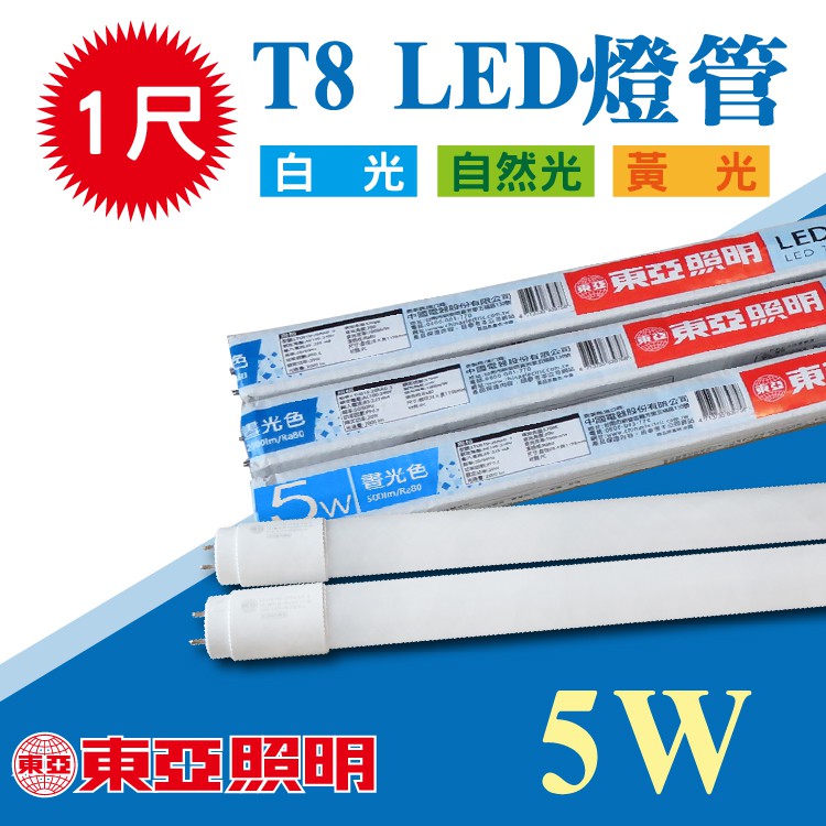 【奇亮科技】東亞 T8 燈管 1尺 LED燈管 5W 白光 LED燈管 一尺 省電燈管 無藍光 快速出貨 附發票