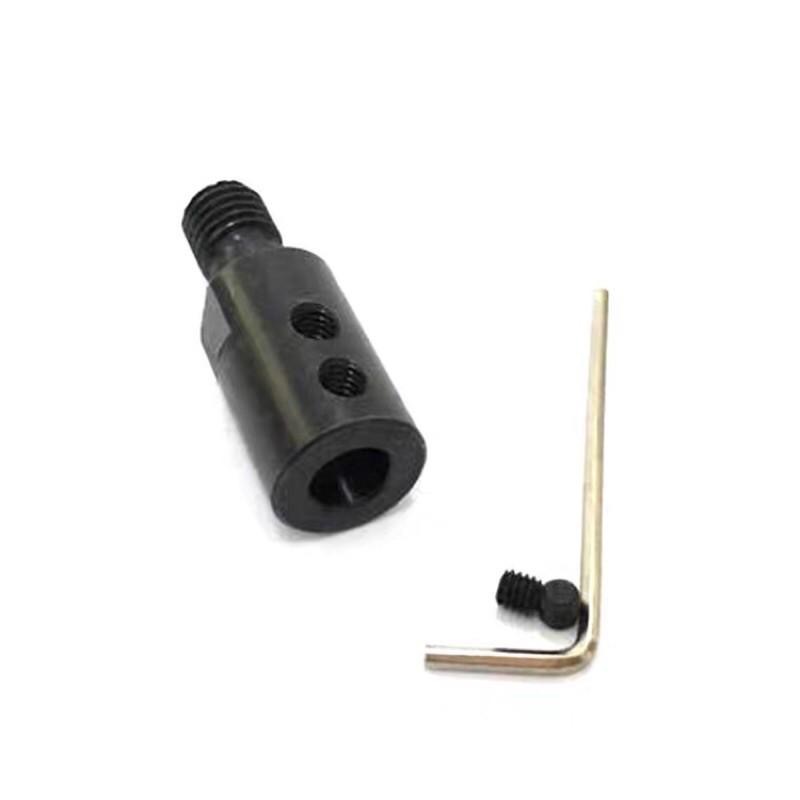 內孔規格:5/6/6.35/8/10/12mm 外徑:5~8mm:16mm/10mm:18mm/12mm:20mm 螺紋長度:11mm 總高度:42mm 規格說明:例如5mm,使用於電機軸直徑是5mm的,比如775/755/795/885/895電機等。 頂絲:頂絲是用來固定電機軸的側面的螺絲孔,已經配有的內六角機米螺絲。 材質:45#鋼發黑