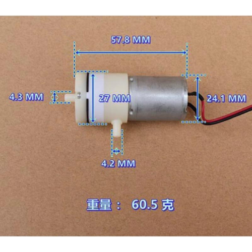 電機 : 370 電機(尾部未焊線的) 適用電壓 : DC5V DC6V 電壓 :DC5V 電流 : 0.35 A 電壓 :DC6V 電流 : 0.4 A 重量 : 60.5 克 通電試機,DC5V的時候聲音柔和,吸力很好的,DC6V時的吸力更好了,但聲音稍為大了一點,電壓越高,吸力越好,但功率越大,電流也就越大了,聲音也相對大了一點,這只微型真空泵的性能非常好,吸力大,但聲音不算噪的,而且它的打氣量非常好,當作一個打氣泵應該是非常優秀的,但這款泵應該不適合當作水泵,請買家朋友注意,估計氣囊的構造不同的。