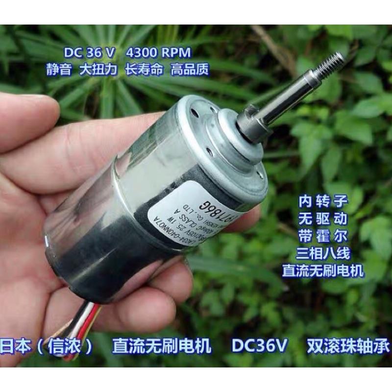 全新原件的日本(信濃)直流無刷電機,內轉子,無驅動板,帶霍爾,三相八線直流無刷電機,一件是 30 PCS,包裝完整,做工非常精美,外觀亮麗,又是一批美美的高品質直流無刷電機。 這電機個子雖然不大,但功率不小,的外徑是36.5 MM,比以前的那批尼得科直流無刷電機(外徑41.8MM)小很多,但拿在手上沈沈的,重量跟那個尼得科電機是一樣重的,而且功率也是差不多。 這批電機的額定功率是 DC105V,但經通電試機,它適用電壓很寬,在DC36V,DC48V,DC60V,的工作狀態就非常好了,靜音,大扭力,雖然電壓降低了一點,功率被削弱了,但扭力已經相當強大了,而且更靜音,應該更不容易發熱,更適合長時間工作,其實,當DC24V時它的扭力就非常不錯了。 不過要注意霍爾輸出線的線序要對好,如果霍爾的線序接不對,要麼電機抖動不轉,要麼電機轉速快很多,電流很大但扭力很小,如果出現以上情況,請將霍爾的三條輸出線其中的二條掉換一下試試。 它的轉子表層噴塗成黑色,刮開表層,可以明顯看到稀土的成分,它雖然不是釹鐵硼高強磁,但磁性挺強的,是中強磁了。 無刷電機的正常使用壽命很長,電機採用高品質的NMB滾珠軸承,這樣就更穩定,更加有保障,它的引線末端是 8 P 的端子,如果用不到也可以直接剪掉,其中的三條粗線(紅線,黑線,白線)就是電機的的三條主線: 五條細線就是霍爾的五線,其中荼色線接正極,藍色線接負極,其他三線就信號輸出線,注意正負極不可接錯,信濃電機的線的顏色都是比較淡的,請注意仔細辨別線的顏色。 電機直徑 :36.5 MM 電機長度 : 61 MM 電機軸徑 : 5 MM(末端是 3.9MM 正牙螺紋) 輸出軸長度 :35.5 MM 引線長 : 大約 90 MM(8 P) 重量 : 232 克 (其中三條粗線是電機的三相主線,五線細線是霍爾五線) (霍爾五線中的茶色線是正極,藍色線是負極,另外三條線是輸出線) 用電動車的萬能驅動器能完美驅動這只電機(可以只接3線也可以8線全接),也能調速,也可以正反轉,如果只接3線,DC12V時也可以驅動它,但如果要接8線的話,最低電壓是要DC24V才可以驅動這只電機,估計是霍爾的關係吧。不過要DC12V時的扭力太小了,其實也意義不大。 這只電機的額定電壓是 DC105V,轉速估計是 10000多轉,我們沒有合適的驅動器可以測試它,只能測試它在DC60V以下的不同轉速了,實測參數如下 : 電壓 : DC24V 轉速 : 2800 轉 電壓 : DC30V 轉速 : 3500 轉 電壓 : DC36V 轉速 : 4300 轉 電壓 : DC48V 轉速 : 5800 轉 電壓 : DC60V 轉速 : 7100 轉 很難碰得到這麼精美的內轉子直流無刷電機,還是日本(信濃)大品牌的無刷電機,質量當然桿桿的,美中不足的是額定電壓是 DC105V,這種電壓的驅動比較難找,由於測試它在DC36V,DC48V,DC60V的低電壓狀態下的性能也非常卓越,超靜音,平穩,大扭力,所以建議降低電壓使用,當然,你如果有DC105V的驅動板,也盡可放心使用,信濃無刷電機,質量非常好的哦........