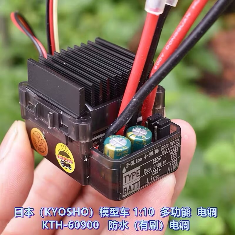 庫存全新的車模電子速度調節器,是適用於攀爬車1:10車模使用的有刷電調,這批車模電調是以前為(日本)KYOSHO 代工的車模電調,型號是 KTH-60900,有帶BEC(+5V)2A 輸出,電調適用電壓是 2S-3S(7.4V-11.1V),電流有可能是 50A-60A之間吧。(從型號上猜測,尚未覈實),插頭是大公插,電調的標籤標示是有防水的多功能電調,這只電調帶有二組跳針可選擇,至於是選擇什麼的功能我們就不懂了。