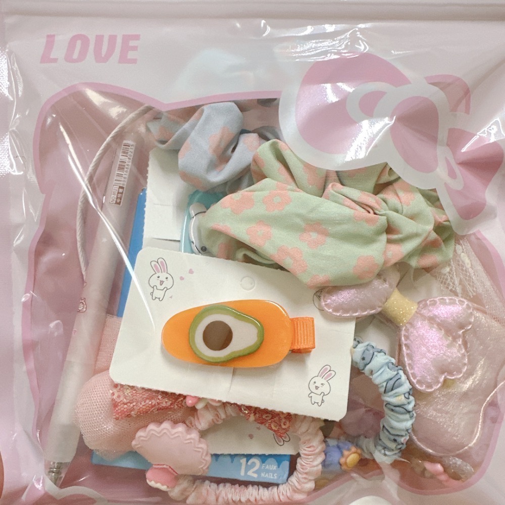 內容物包含:原子筆*1、香片*1、兒童指甲貼*1、髮夾*4、髮圈*4、大腸圈*2、髮箍*1