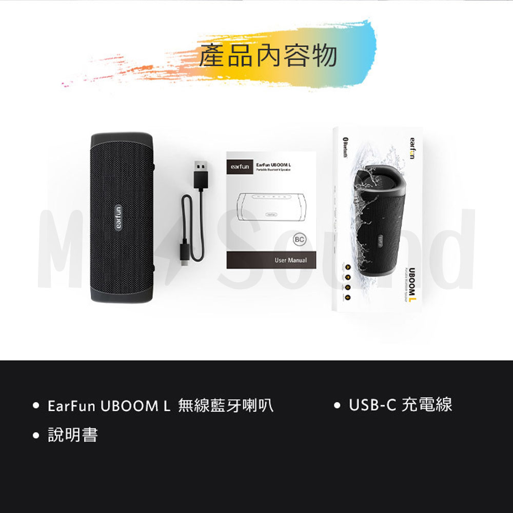 .商品內容物:EEarFun UBOOM L 無線藍牙喇叭、USB-C充電線、說明書