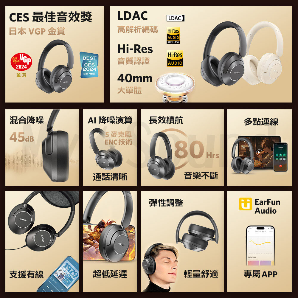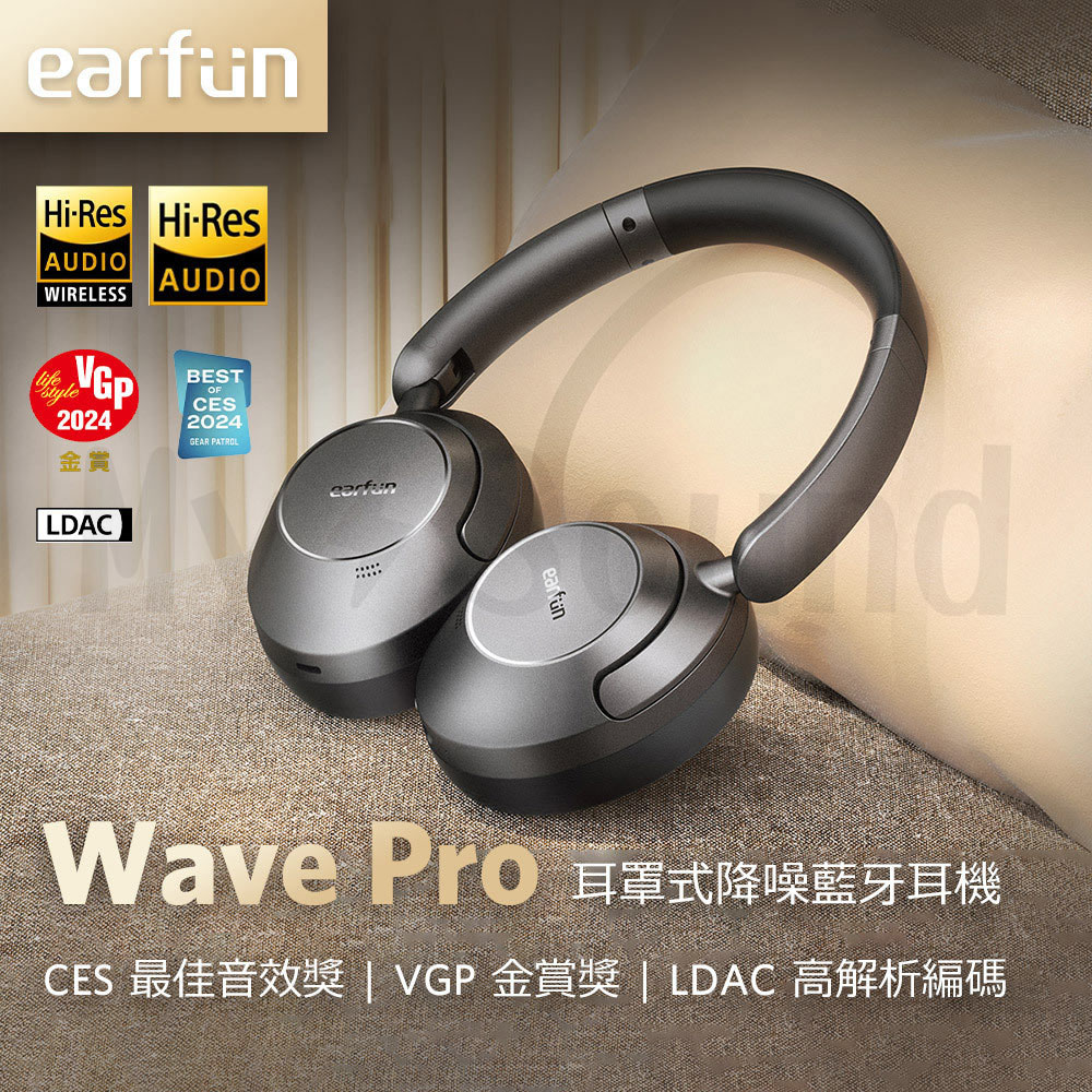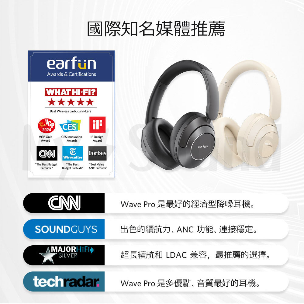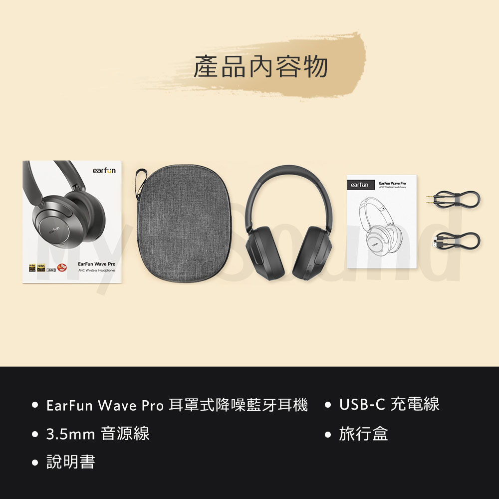 .商品內容物:EarFun Wave Pro 耳罩式降噪藍牙耳機、旅行盒、3.5mm 音源線、USB-C線、說明書