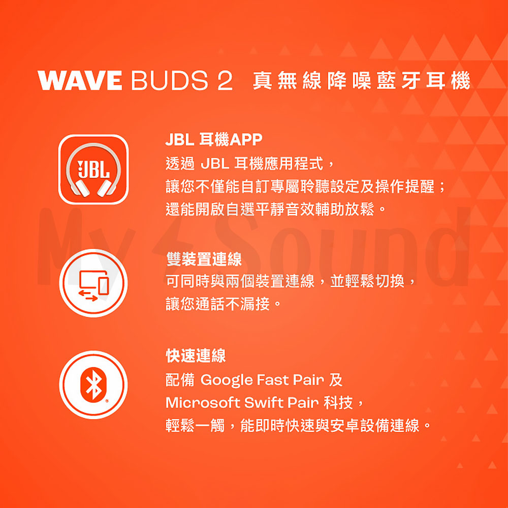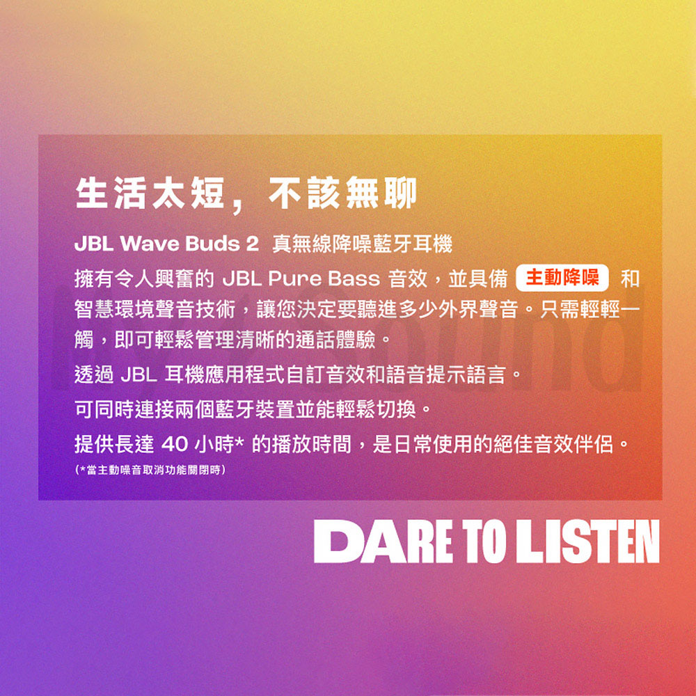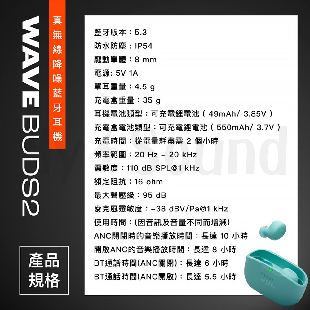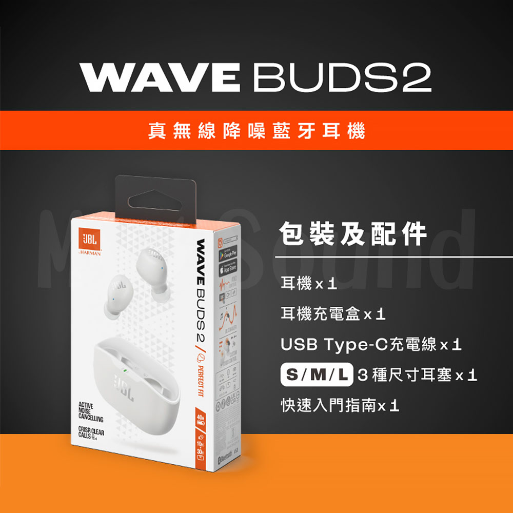 ‧產品特色:JBL Wave Buds 2耳機*1、充電盒*1、3種尺寸矽膠耳塞各1組、快速入門指南*1、USB Type C - Type C 線材*1