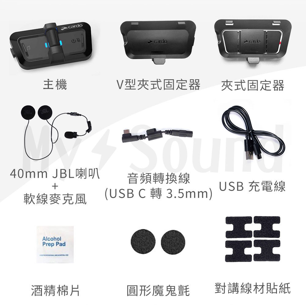 商品內容物:Cardo PACKTALK OUTDOOR 戶外運動通訊藍牙耳機、40mm JBL 喇叭、機座、固定器、USB-C充電線、軟線麥克風、對講線材貼紙、音頻轉換線(USB-C轉3.5mm)、1副圓形魔鬼氈、1包酒精消毒棉片、說明書