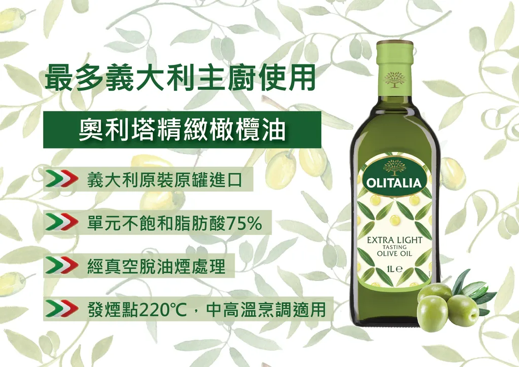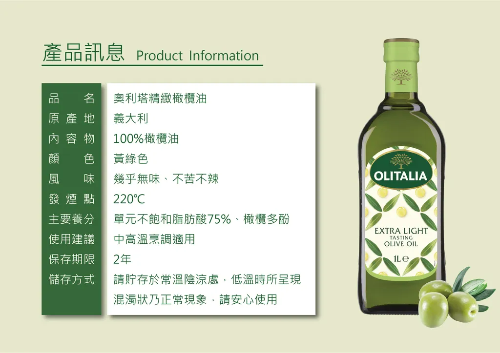 適用於中高溫烹調,清炒,油煎,油炸、富含橄欖多酚