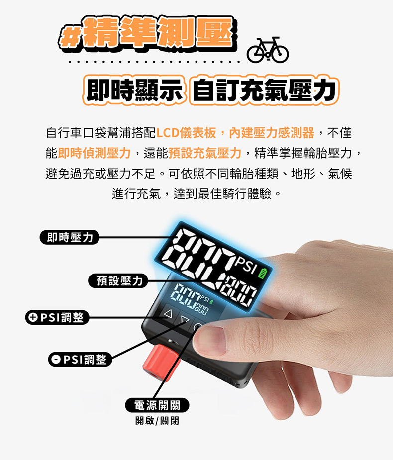 A:幫浦內建壓力偵測器,當充氣達到指定壓力時,即會停止充氣。請留意:充氣壓力設定請務必遵照輪胎可承受的壓力範圍指示(通常會標註在輪胎側邊),若不清楚輪胎可承受壓力範圍可向相關廠商諮詢。