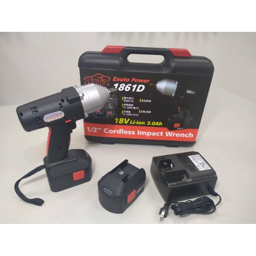 *最大扭力 800牛頓米(8157kgf/cm) *打擊頻率2400次/分 *轉數:0~1800轉/分 *四角頭(1/2) *5秒最強輸出 *雙電池配備 *電池電量顯示 *多工充電器 *台灣專業製造 *充電電壓:100~240V 50/60Hz *充電時間:80~90分鐘 *全套含:電池*2 充電器*1 主機*1