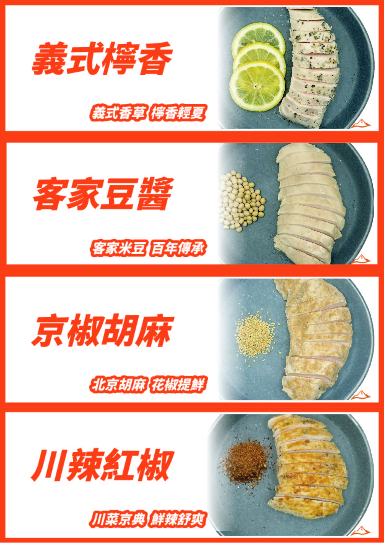 減鈉鹽雞胸*2 台蒜胡椒*2 港式蔥香*2 義式檸香*2 客家豆醬*2 京椒胡麻*2 川辣紅椒*2