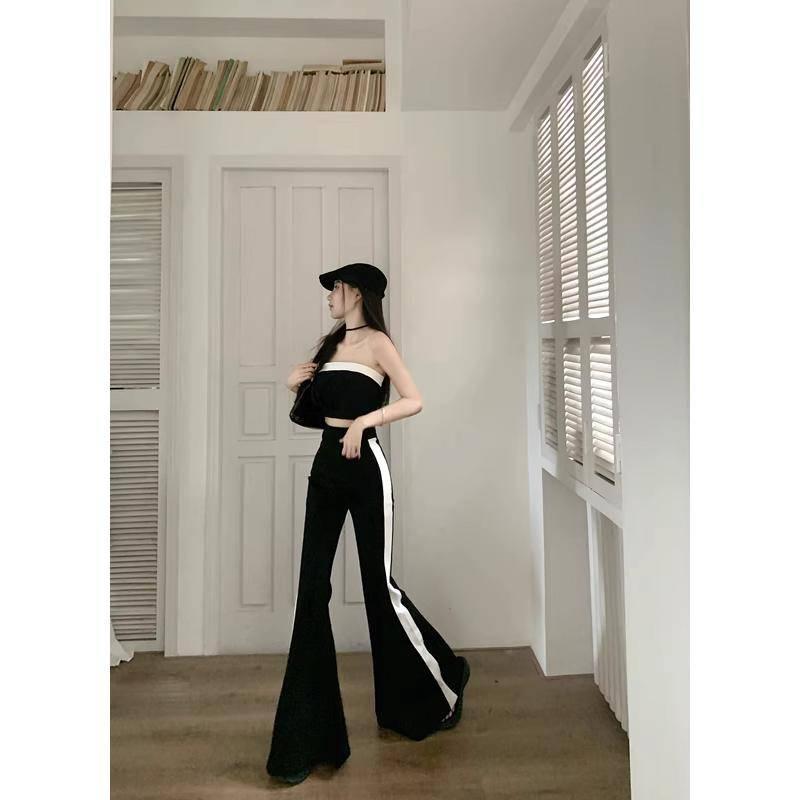 W.A.N.Y.I辣妹撞色抹胸背心上衣+喇叭闊腿褲兩件套套裝