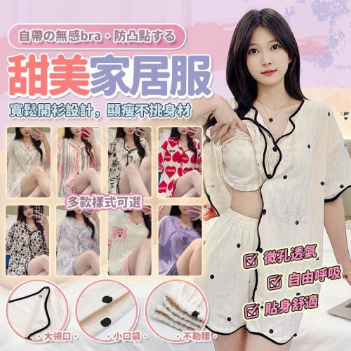 🎉新北出貨🎉睡衣女 帶胸墊甜美女士開衫薄款套裝 夏季短袖短褲睡衣 夏天家居服 睡衣女春秋款 睡衣