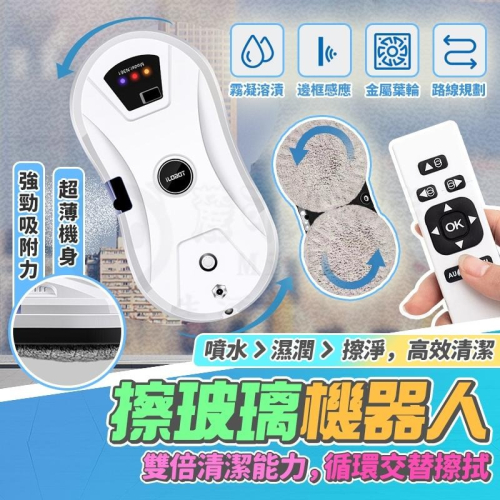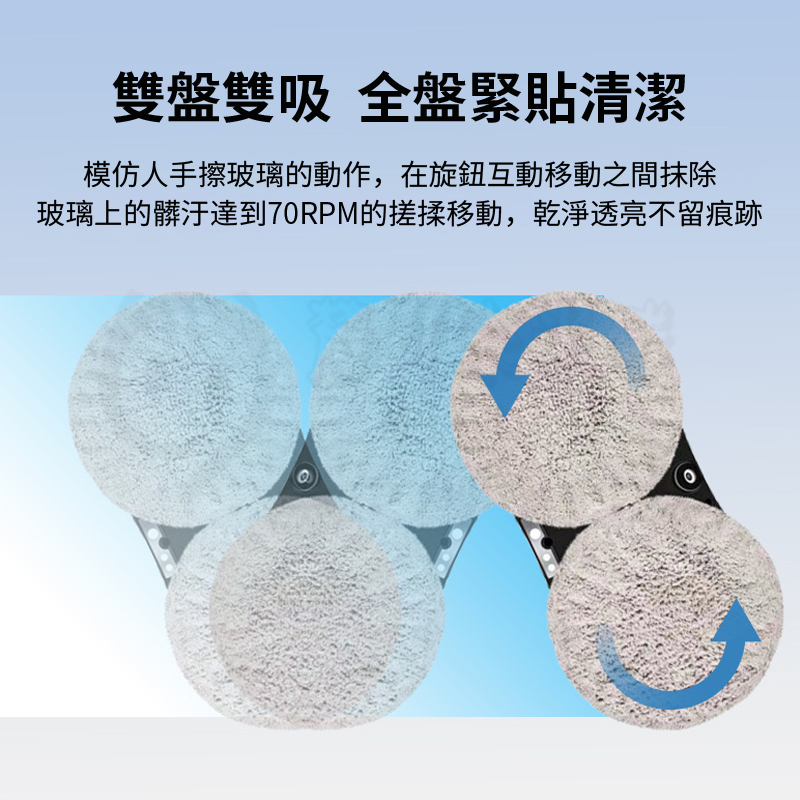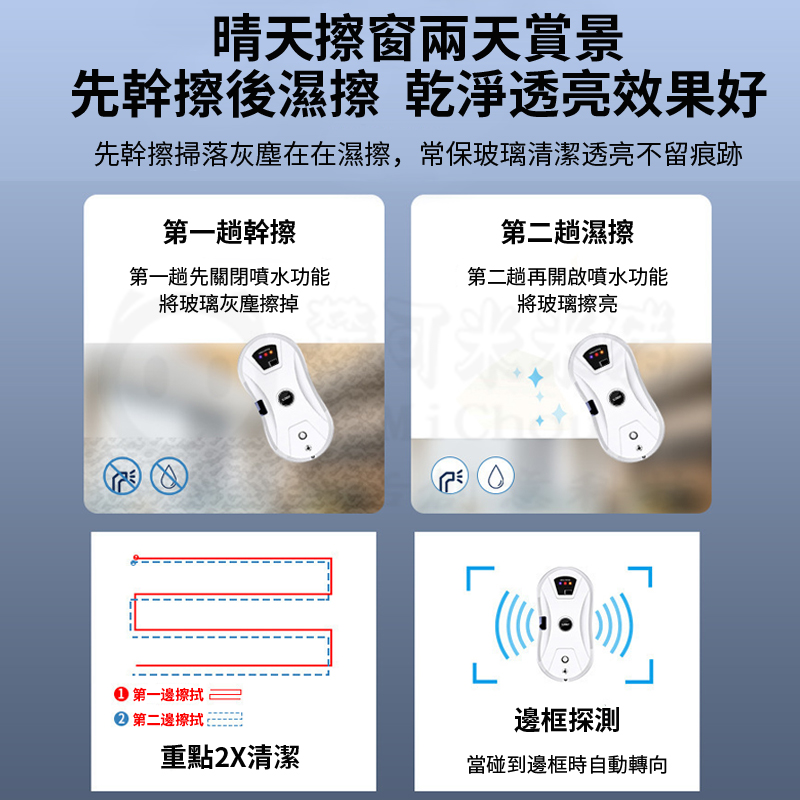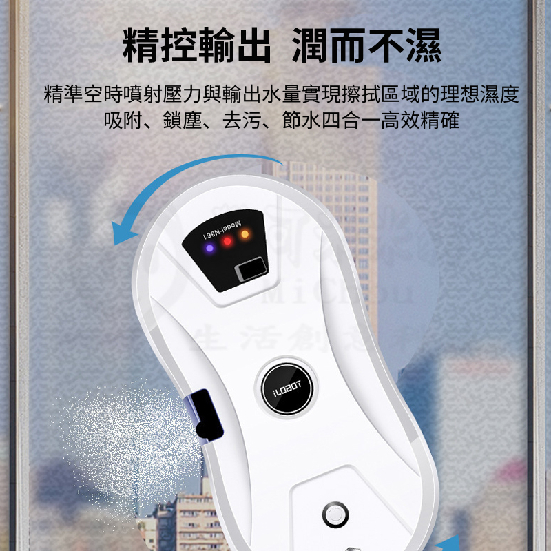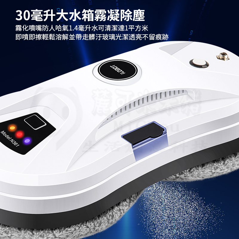仿人工擦拭、智能路徑、智能遙控、不斷電保護(斷電時可持續吸附20分鐘,同時鳴笛示警)、自動噴水
