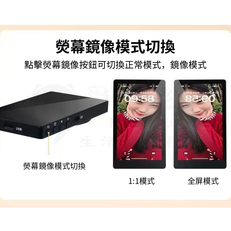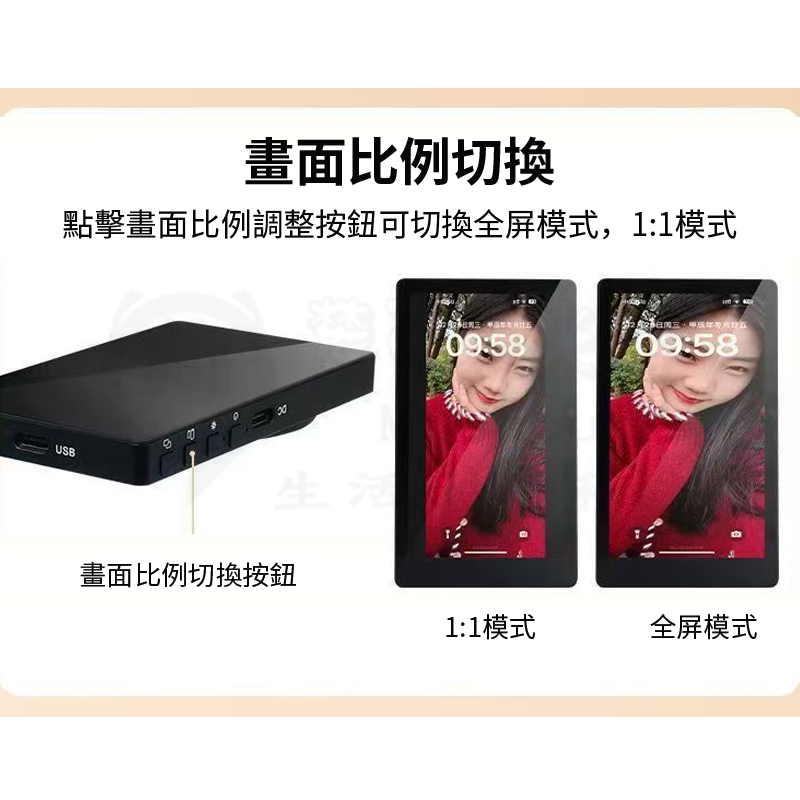 6.按鍵功能:畫面比例切換調節,屏旋轉,電源,