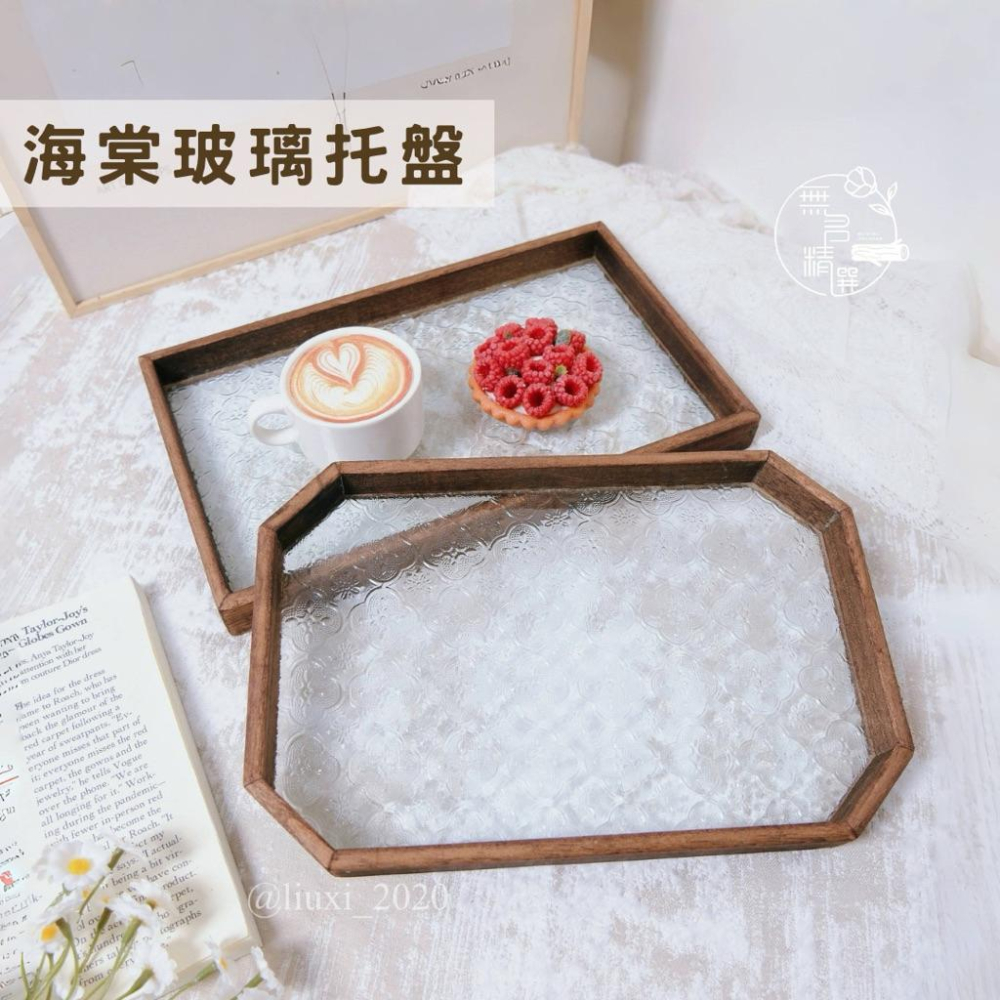 現貨🔺海棠玻璃托盤|外婆茶几上的一盤點心|木質托盤|長方形茶盤|復古茶水杯子水果 收納盤|點心端盤|飾品收納 咖啡廳餐盤