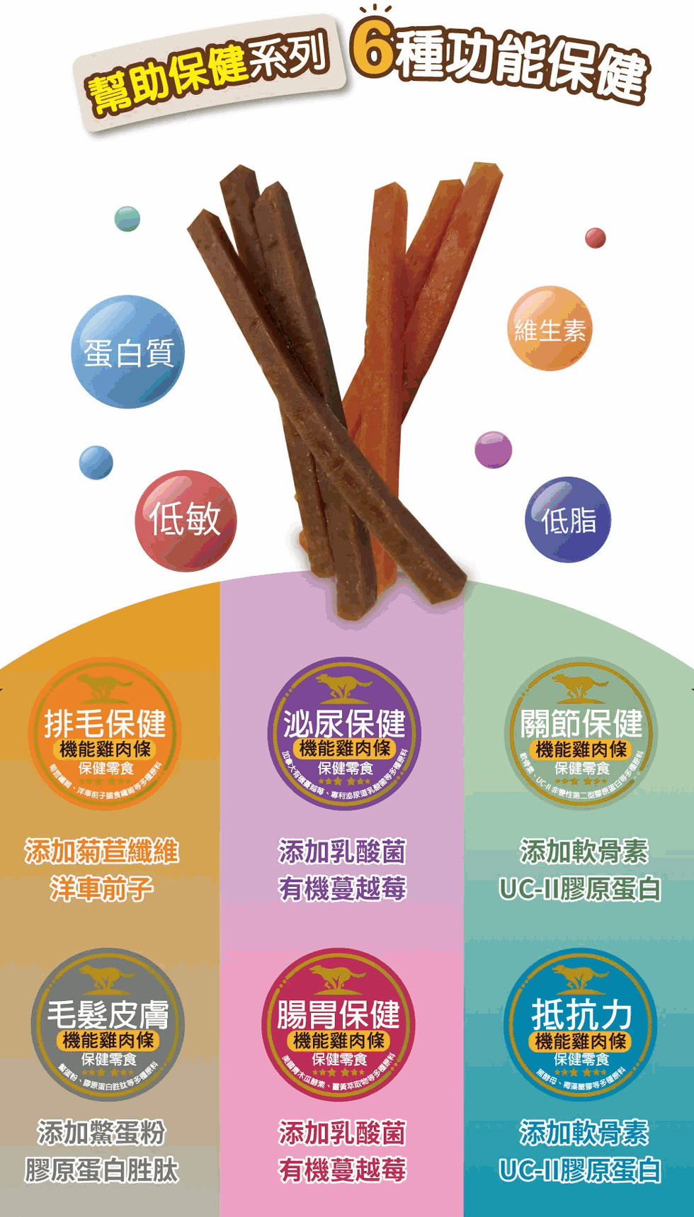 成分:雞肉,黑酵母,葡聚多醣(β-葡聚醣),褐藻醣膠,維生素C,維生素D3,酪酸菌,膠原蛋白胜肽,Omega3,鋅。