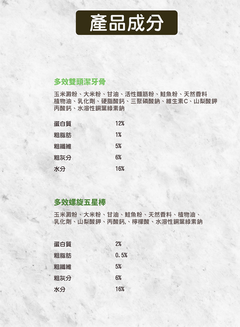 主要成分:植物性蛋白、酪蛋白酸鈉、 澱粉、 植物性甘油、 天然香料、 植物油、鮭魚粉、 乳化劑、 磷酸氫鈣、 山梨酸鉀、 丙酸鈣、 迷迭香萃取物、 綠薄荷油、薄荷油、水溶性銅葉綠素鈉。