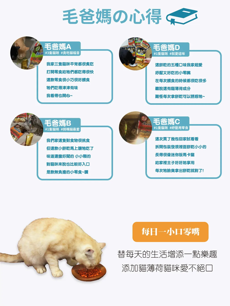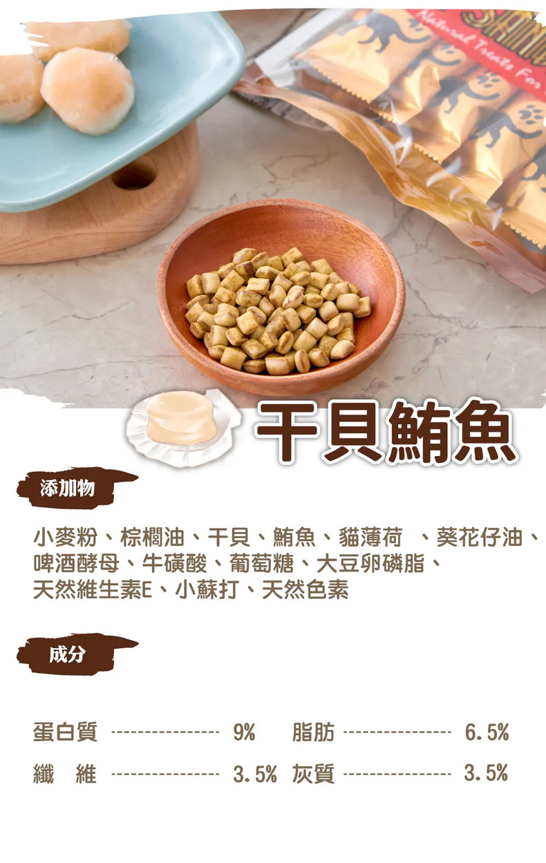 成分:小麥粉,棕櫚油,干貝,鮪魚,貓薄荷,葵花仔油,啤酒酵母,牛磺酸,葡萄糖,大豆卵磷脂,天然維生素E,小蘇打,天然色素。