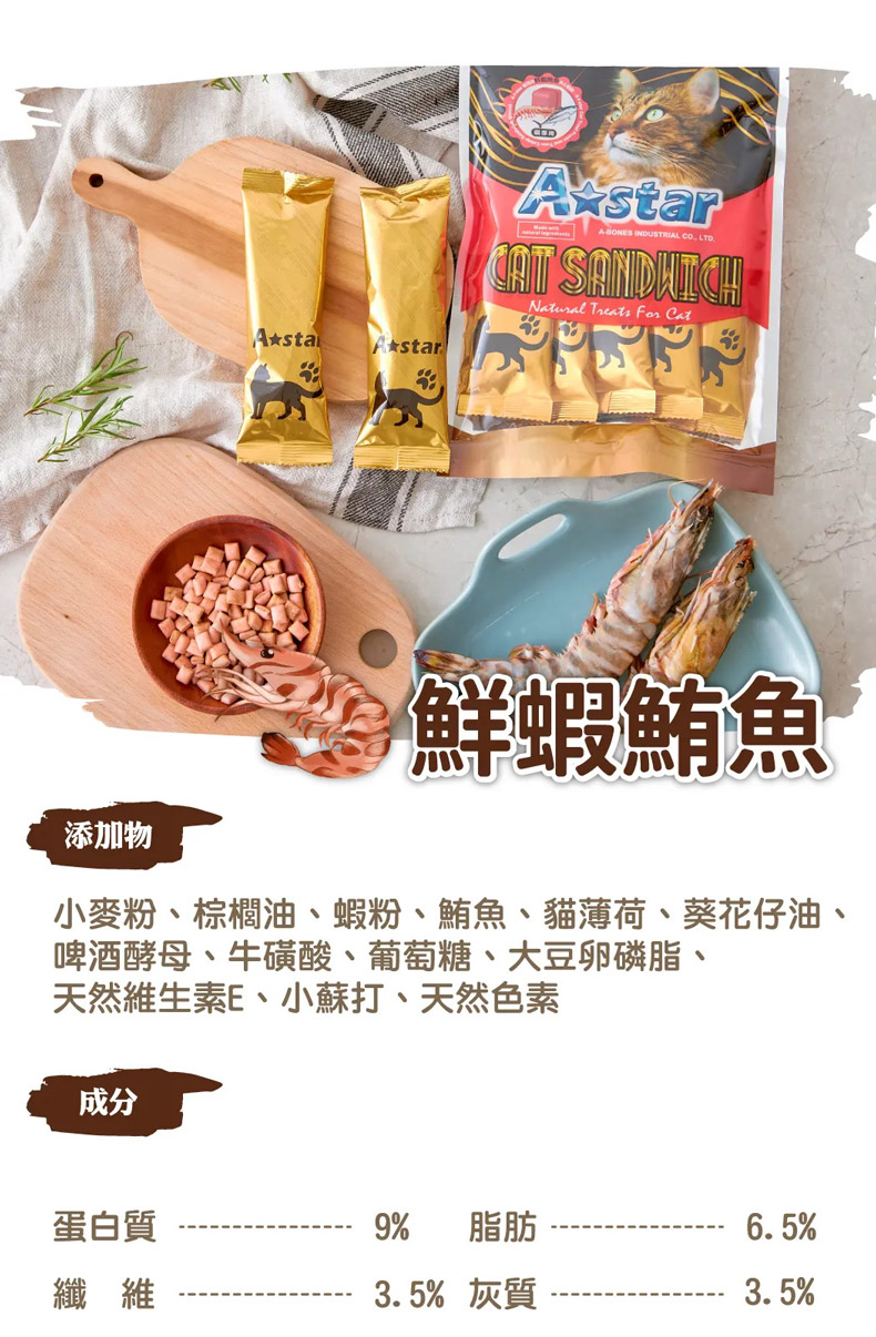 成分:小麥粉,棕櫚油,蝦粉,鮪魚,貓薄荷,葵花仔油,啤酒酵母,牛磺酸,葡萄糖,大豆卵磷脂,天然維生素E,小蘇打,天然色素。