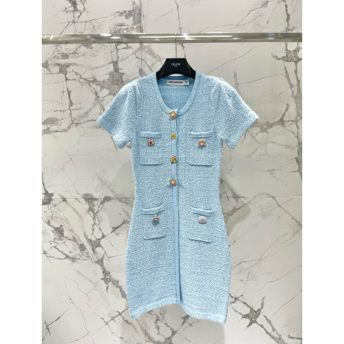 薄霧藍紐扣針織短袖連衣裙