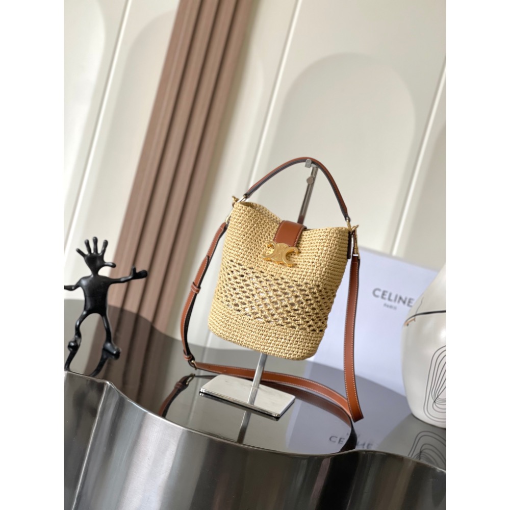 Celine編織❤️LOUISE小號植物材料和牛皮革水桶包 ,天然色/棕褐色,尺寸16 X19X12釐米 ,植物材料,牛皮革包邊無襯里金色飾面