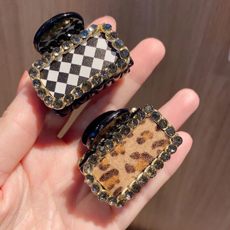 【台灣現貨】韓式豹紋棋盤格抓夾 小鯊魚夾 鑽石金屬鏈條 高級感黑白格髮夾 瀏海夾 公主頭 髮飾 棋格紋 小抓夾