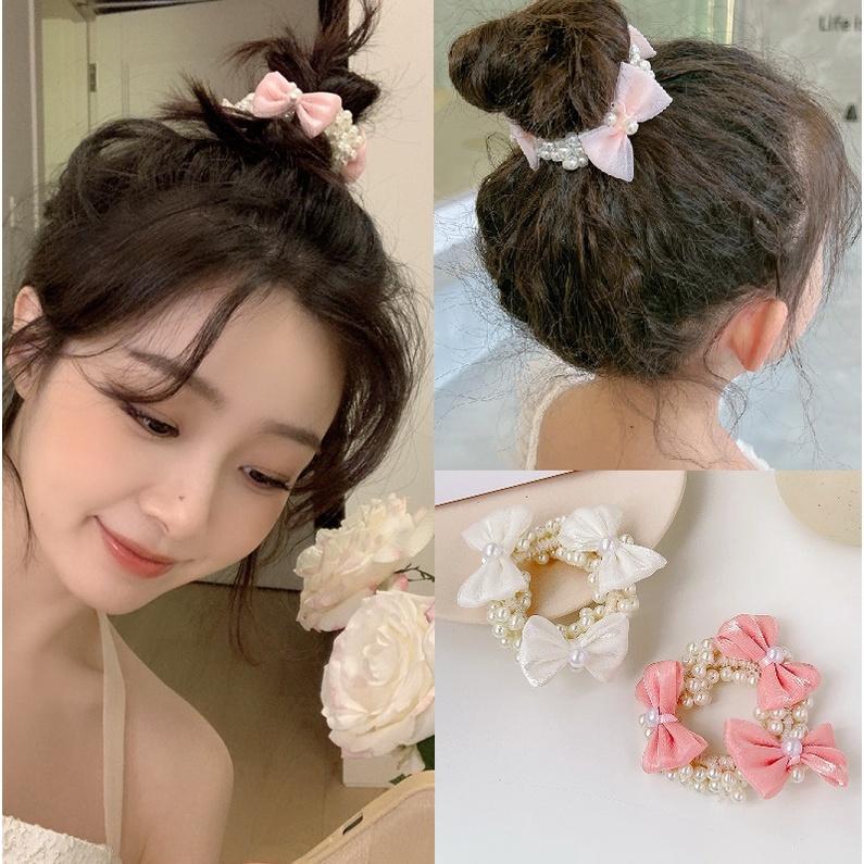 【台灣現貨】可愛蝴蝶結珍珠手環髮圈 緞面髮帶 大腸圈 髮飾 髮繩 橡皮筋 頭繩 頭飾 兒童 女童 小朋友 KH311