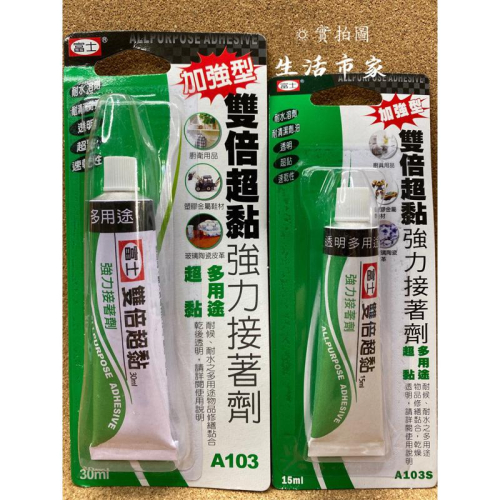 https://s-cf-tw.shopeesz.com/file/tw-11134208-7qul7-lhbqufpw91d832 ※ 注意事項 ※ 🌟本店都是由台灣出貨呦 🌟現貨 當天 或 隔天會立即出貨 🌟退貨商品須為全新狀態且完整包裝,含商品本體、附件、內外包裝等等 🌟出貨都是錄影在包貨 所以放心喲❤️ 🌟如需量大可以先透過聊聊私訊我詢問喲 🌟全新商品 享有7天保障期 安心購買 大大保障🌟 🌟蝦皮店到店 物流會較慢有時需等到1-3週 ※開立統編請在結單處電子發票選擇三聯式發票 打上統編喔※ 用途 : 浴室、廚房、戶外之玻璃、磁磚、陶瓷物品、金屬、硬質塑膠、與皮革布織物品也有良好的結著性,可以耐水、清潔劑、油、溶劑等. 使用方法: 請先清潔欲接著兩面後將本膠均勻塗抹,等待10~20分鐘後,膠不黏手時再加壓接合後即可達基本接合,24小時後發揮最大黏度,塗抹過量將使黏合時間加長。 🔆🔆🔆 品名:加強型雙倍超黏強力接著劑 - A103S 材質:合成樹脂、乙烯乙醇、丙酮、丁酮 容量:15ml 產地:台灣 🔆🔆🔆 品名:加強型雙倍超黏強力接著劑 - A103 材質:合成樹脂、乙烯乙醇、丙酮、丁酮 容量:30ml 產地:台灣 #現貨 #台灣製 #富士 #加強型 15ml / 30ml #雙倍超黏 #強力接著劑 #速乾耐水溶劑 #塑膠修補 #金屬修補 #防水 #修補