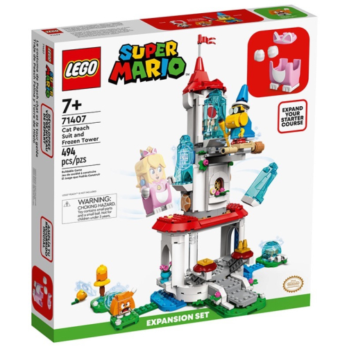 孩子可用貓咪碧姬公主服與冰凍塔(71407)拼砌超酷的樂高® 超級瑪利歐™ 關卡。內有貓咪服可讓樂高® 碧姬公主™(未附此玩偶)穿上並爬上積木組成的塔,還有 3 個樂高玩偶:卡美克、奇諾比奧與貓咪栗寶寶。玩家從「冰」裡解放金幣磚塊並跳上去、拿走黃色果實、(啟動 POW 磚塊後)讓卡美克從塔上掉下來,並破除冰封將奇諾比奧放出來,可贏得獎勵。(請注意:須有 71360、71387 或 71403 冒險主機才能遊玩。)