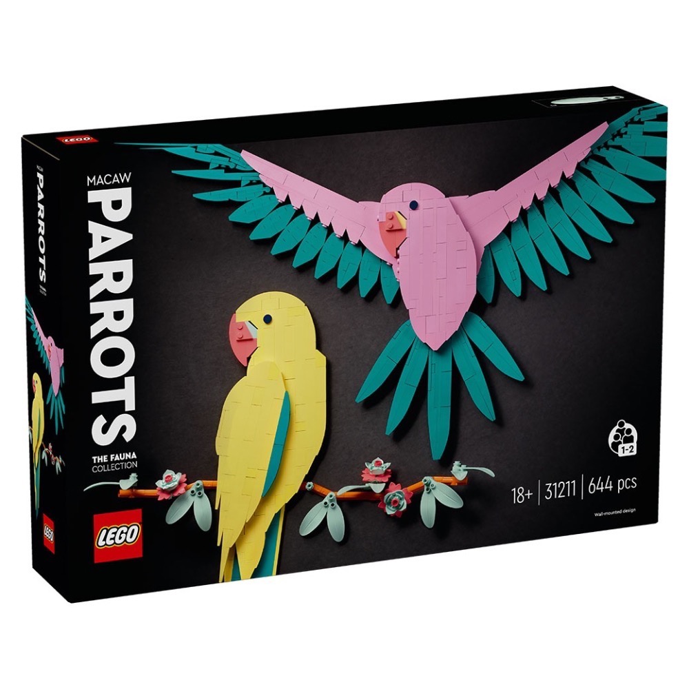 - 大自然壁飾-運用此盒組的 644 個樂高® 積木製作有 2 隻金剛鸚鵡、色彩繽紛的場景:一隻棲身在有花的樹枝上,另一隻則展翅飛翔