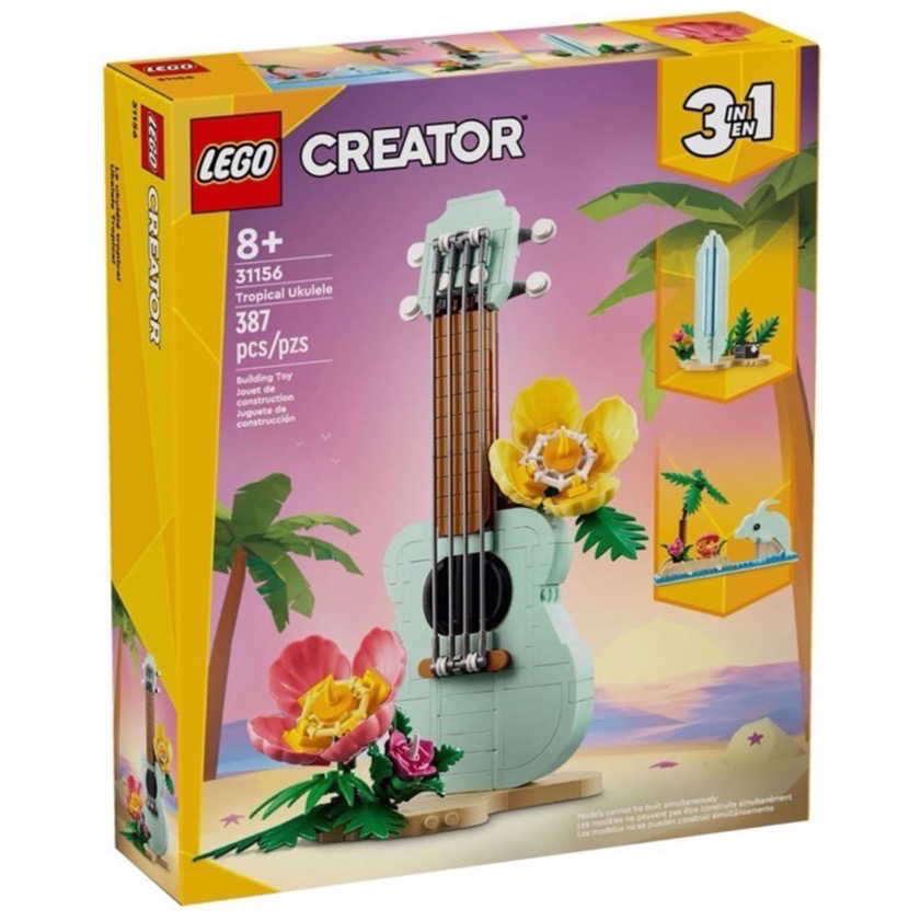 孩子可在 LEGO® Creator 熱帶烏克麗麗(31156)3 合 1 盒組中,拼砌、遊玩與展示 3 種海灘主題模型。此盒組是適合 8 歲以上女孩和男孩的送禮好點子,內有 1 把烏克麗麗,擺在有 2 朵色彩繽紛的花和草的海灘場景底座上。此樂器玩具可從底座拆下,並有 4 條彈奏時會振動的塑膠琴弦。